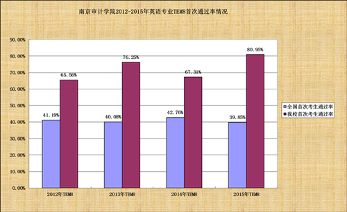 2012-2015年来,我校TEM8通过率长期高于全国通过率。2015年,我校TEM8通过率突破了80%大关,比全国首次通过率高出41.1个百分点,创我校近4年来TEM8通过率最佳成绩。