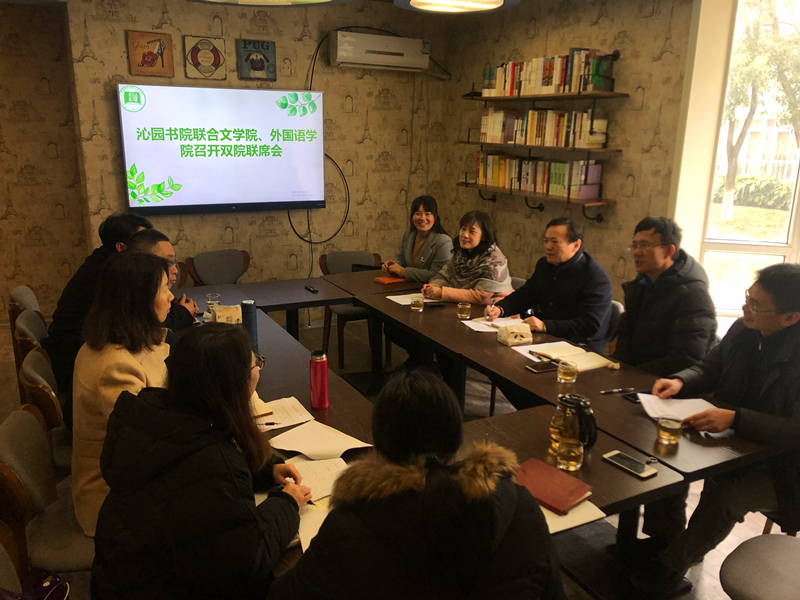 新学期伊始,为加快推动落实学校双院联动会议精神,2月28日中午,沁园书院联合文学院、外国语学院在沁缘书吧召开双院联席会,文学院院长刘顺、副院长王军、外国语学院副书记江振春、副院长熊文、钱永红,沁园书院院长任志成、副院长张文秀、教育管理办公室主任李斌、综合办公室主任周秀丽、辅导员邢文娇和孙琳参加了会议,会议由任志成主持。