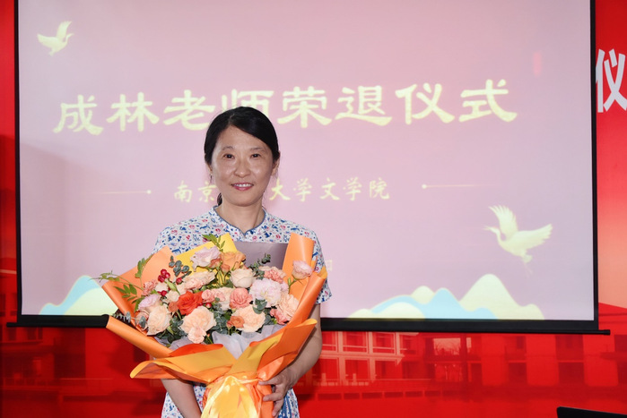 仪式以观看专门为成林老师精心制作的纪念视频为开端,用图片影像的方式回顾了成林老师38年的从教生涯。随后,成林发表了自己的退休感言,她从文学院近20年的发展历程、知足和满足、时代的感恩者三个方面回顾了自己在南审22年工作生活的点点滴滴,表达了对文学院从无到有、逐渐壮大的喜悦,对学校和学院温暖集体的感谢。成林借用“一代人终将老去,但总有人正年轻”的歌词结尾,为文学院送上了自己的祝福:一代人终将老去,文学院永远年轻,永远正青春。