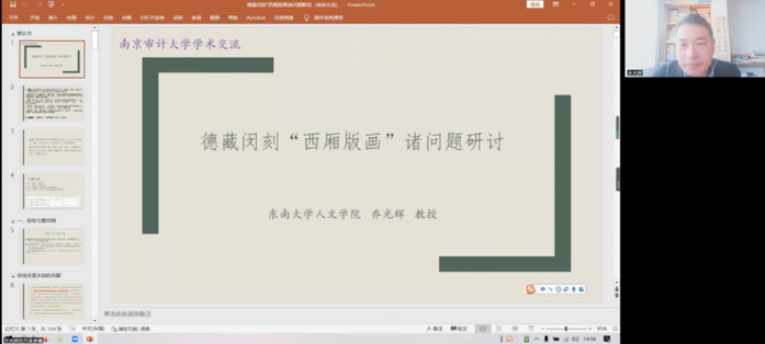 12月14日下午,文学院邀请东南大学人文学院副院长、教授、博士生导师乔光辉在线作“德藏闵刻‘西厢版画’诸问题解读”主题讲座。文学院副院长(主持)朱军教授主持,南审师生及国内各高校160余名师生参加。