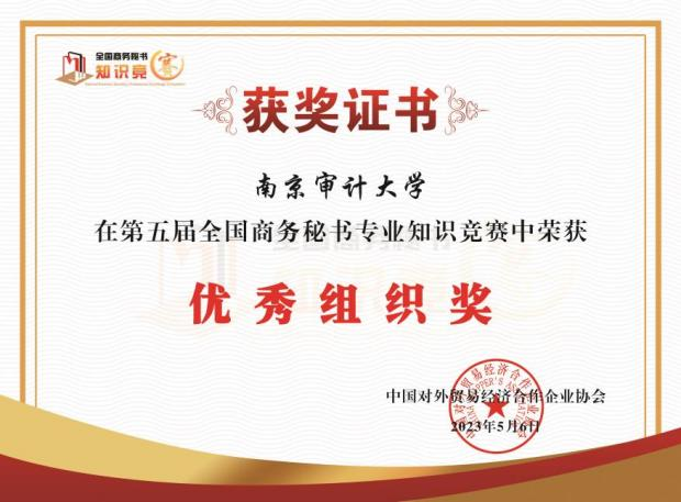 经大赛评委组组织、评审,南京审计大学荣获优秀组织奖,我院学生在本届全国商务秘书专业知识竞赛中取得优异成绩,共有38名同学获奖,其中一等奖5名、二等奖8名、三等奖25名。