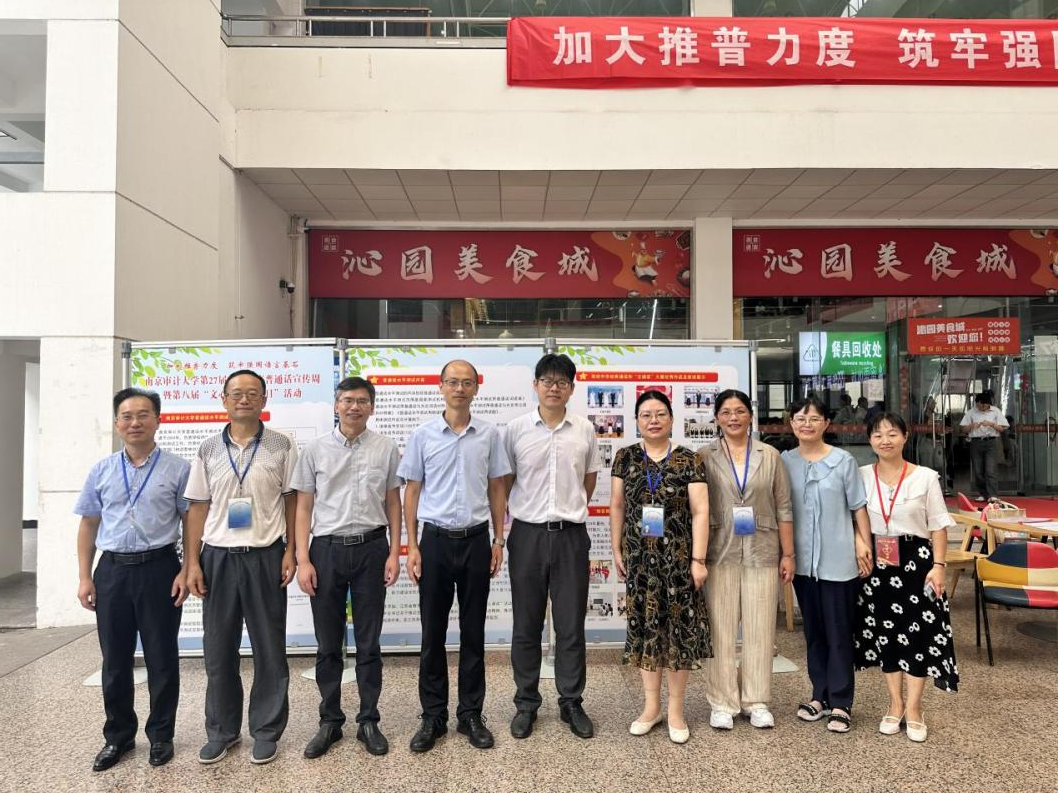 沁园一楼大厅入口处,陈列了三幅大型展板。第一幅展板介绍了南审普通话水平测试考点的历史沿革及所获成果,展示了往年普通话测试及推普周情况。第二幅展板介绍了2020年以来国家颁布的语言文字相关政策法规,详细说明了普通话水平测试的内容及等级标准。第三幅展板展示了南审参与2024年度中华经典诵写讲大赛和江苏百万学子“云诵读”大赛的优秀作品,以及2024年度“推普助力乡村振兴 促进民族融合团结”暑期社会实践活动。此次活动,南审学子通过推广普通话、探索文旅融合和体验红色文化,积极助力乡村振兴和民族融合团结。