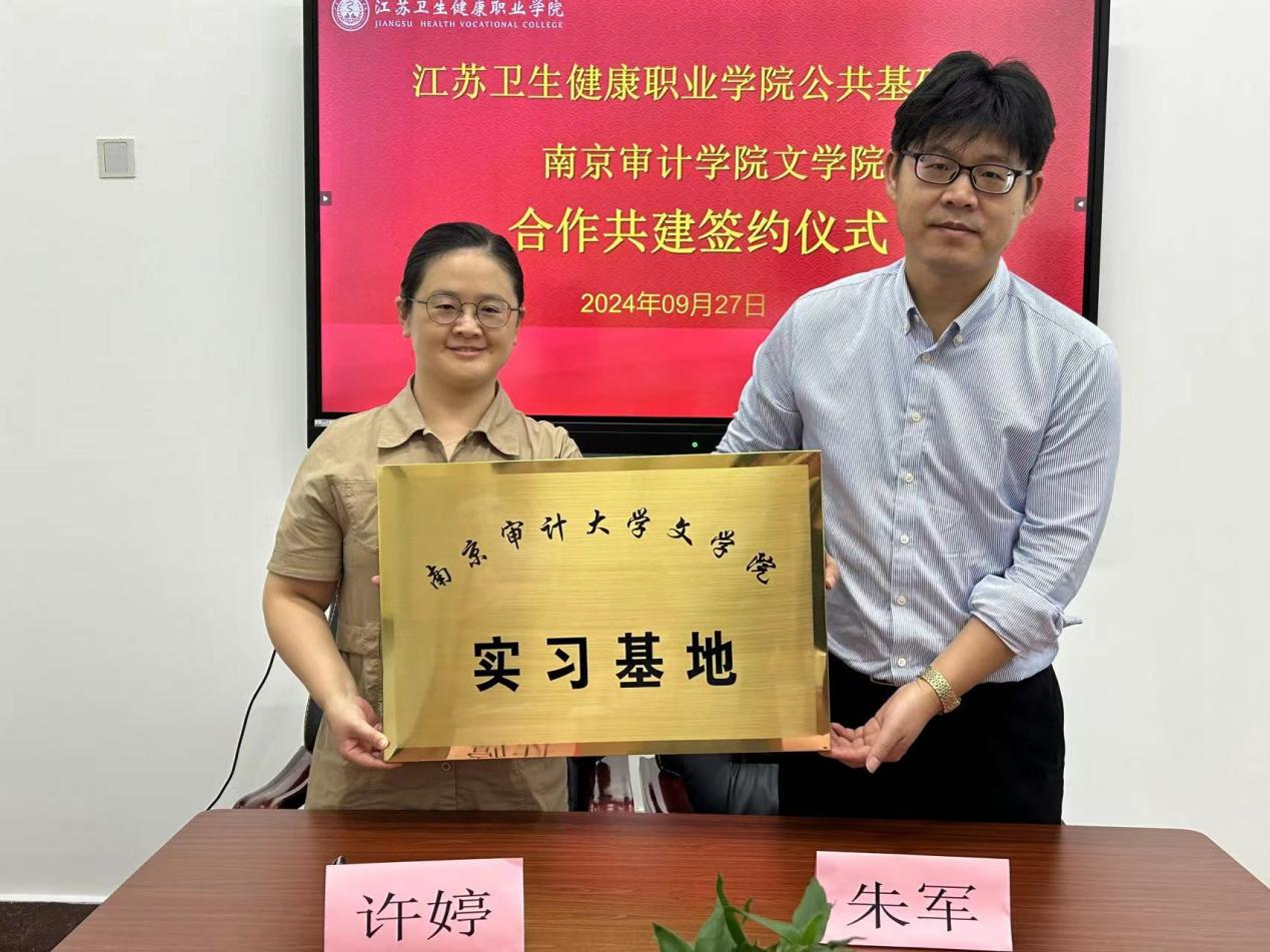 为使我院学生将理论用于实践,在实践中接受多方面教育,提高教学能力,9月27日下午,南京审计大学文学院与江苏卫生健康职业学院公共基础部在江苏卫生健康职业学院图书馆举行合作共建实习基地签约仪式。