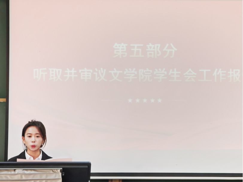 文学院党委副书记赵艺苑在致辞中对大会召开表示祝贺,向全体代表及全院同学致以问候。副书记强调了学习习近平总书记关于意识形态工作重要论述的重要性,肯定了文学院学子过去一年在学科竞赛、对外交流、校园文化活动等方面的成绩,同时指出学生组织在工作机制系统性、服务精准性及品牌活动内涵深化等方面存在的提升空间。希望全体同学志存高远、心怀家园,从文化传统中汲取养分,在专业学习中锤炼本领,学生组织加强自身建设,提升引领力、组织力、服务力,将文学院建设成为温暖、启迪、成长的精神家园。