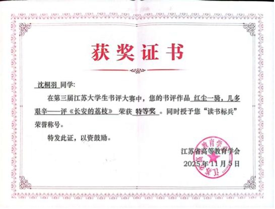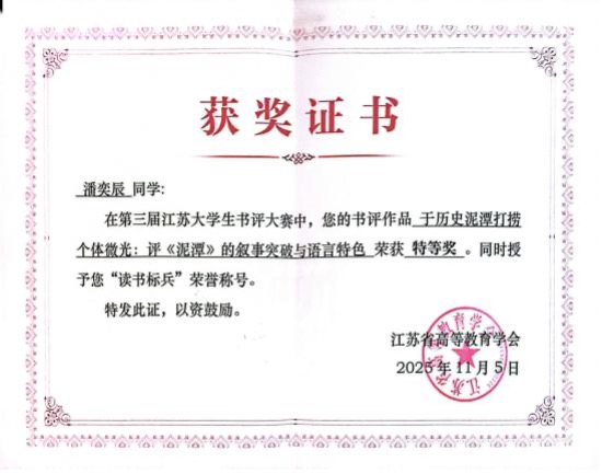 近日,2025年第三届江苏大学生书评大赛省级奖项评选结果揭晓。在教务处和校团委的支持下,文学院作为校级选拔赛主办单位,精心组织并选送的多部学生作品在省级决赛中表现卓越,取得历史性突破。其中,沈桐羽、潘奕辰两位同学的作品荣获省级特等奖(全省共12名),吴佩佩、王雨璐、姚瑜、武慧如四位同学获得省级二等奖。这一优异成绩充分彰显了文学院在人才培养、学科竞赛组织方面的卓越成效与突出贡献。